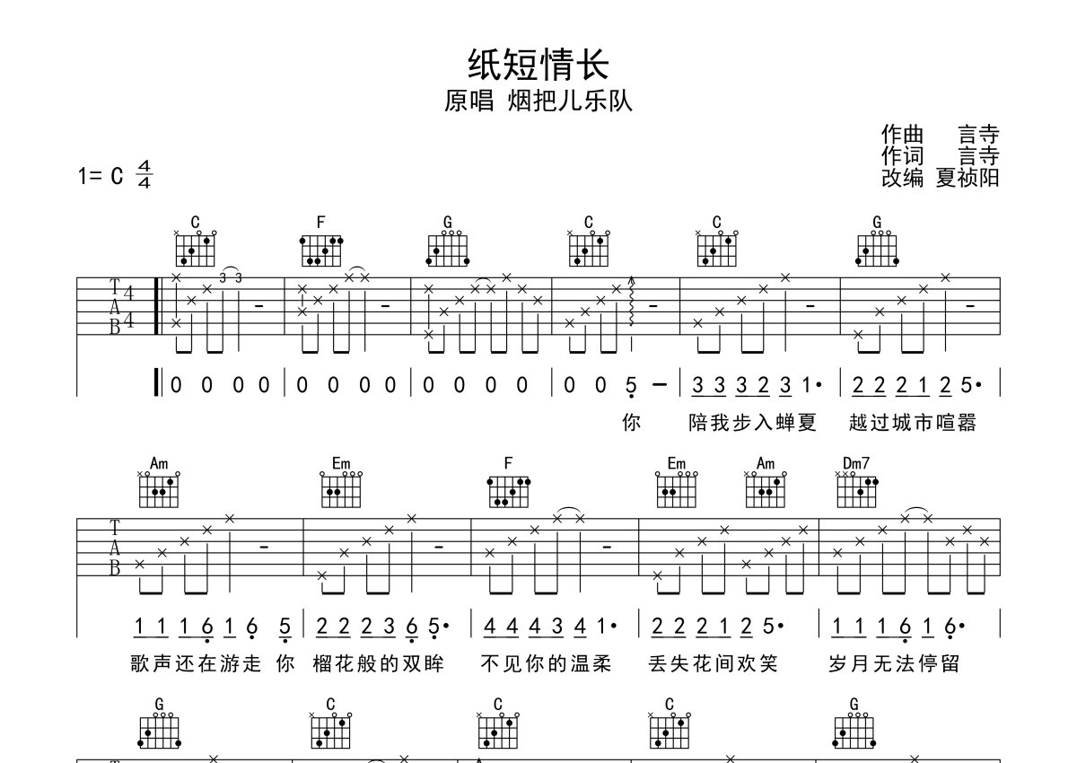 烟把儿乐队《纸短情长》吉他谱 - C调弹唱六线谱