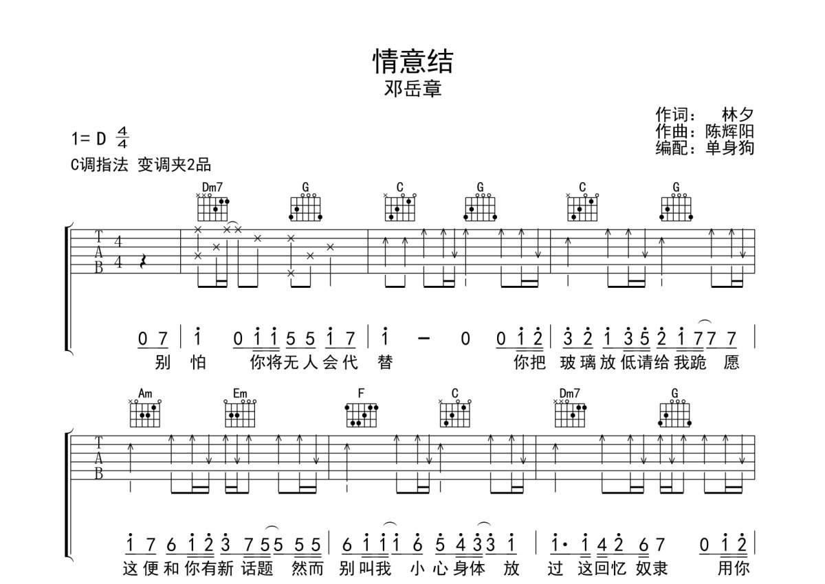 《情意结》是邓岳章演唱的一首歌曲,本吉他谱采用的是C调指法编配,这份吉他谱共有四张高清图谱,图谱由 @单身狗 编配上传,图谱使用六线谱编配,包含吉他和弦指法、简谱以及歌词部分,使用这份情意结吉他谱,可以让你更加方便地掌握这首歌曲的弹唱技巧,快来尝试吧。邓岳章《情意结》吉他弹唱谱,采用C调指法编配,单身狗编配出品,共有4张高清图谱。