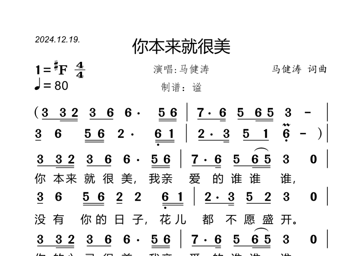 《你本来就很美》是马健涛演唱的一首歌曲,拍号为4/4拍,歌曲速度为每分钟80拍,这份简谱共有两张高清图谱,图谱由 @谧 编配上传马健涛作词作曲并演唱的歌曲《你本来就很美》,完整曲谱,2024年12月19日发行,#F调,4/4拍,速度80,谧精心制谱,大字版,共2页。