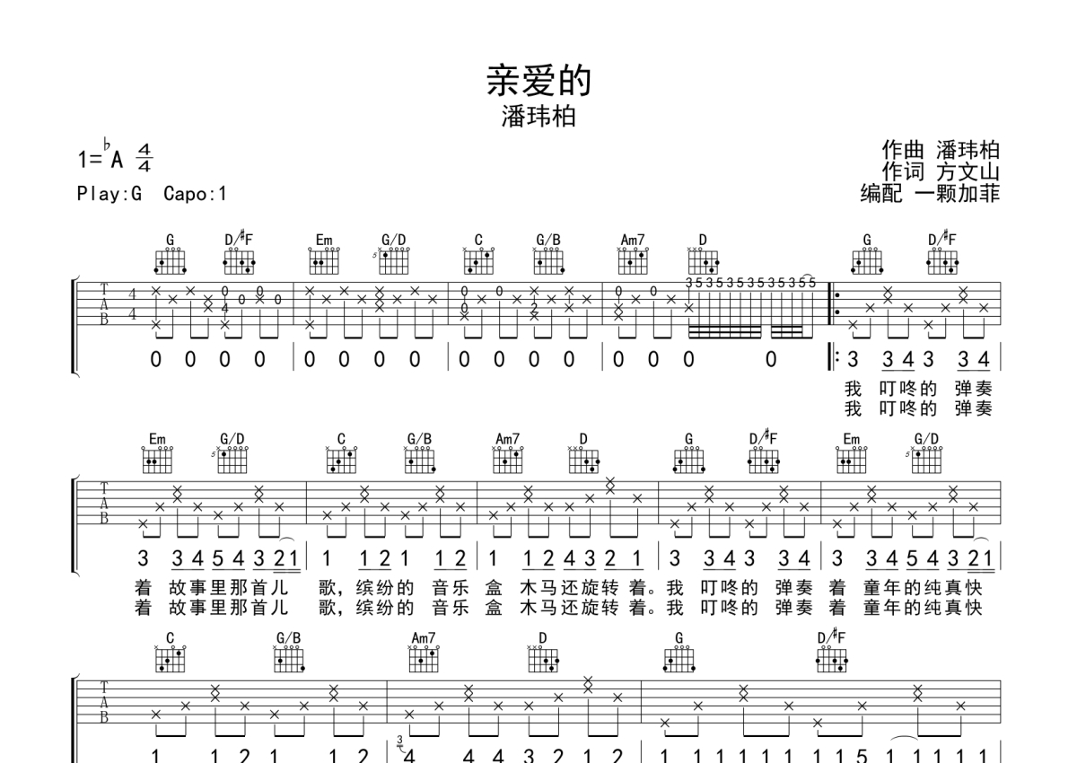 潘玮柏《亲爱的》吉他谱 - G调弹唱六线谱