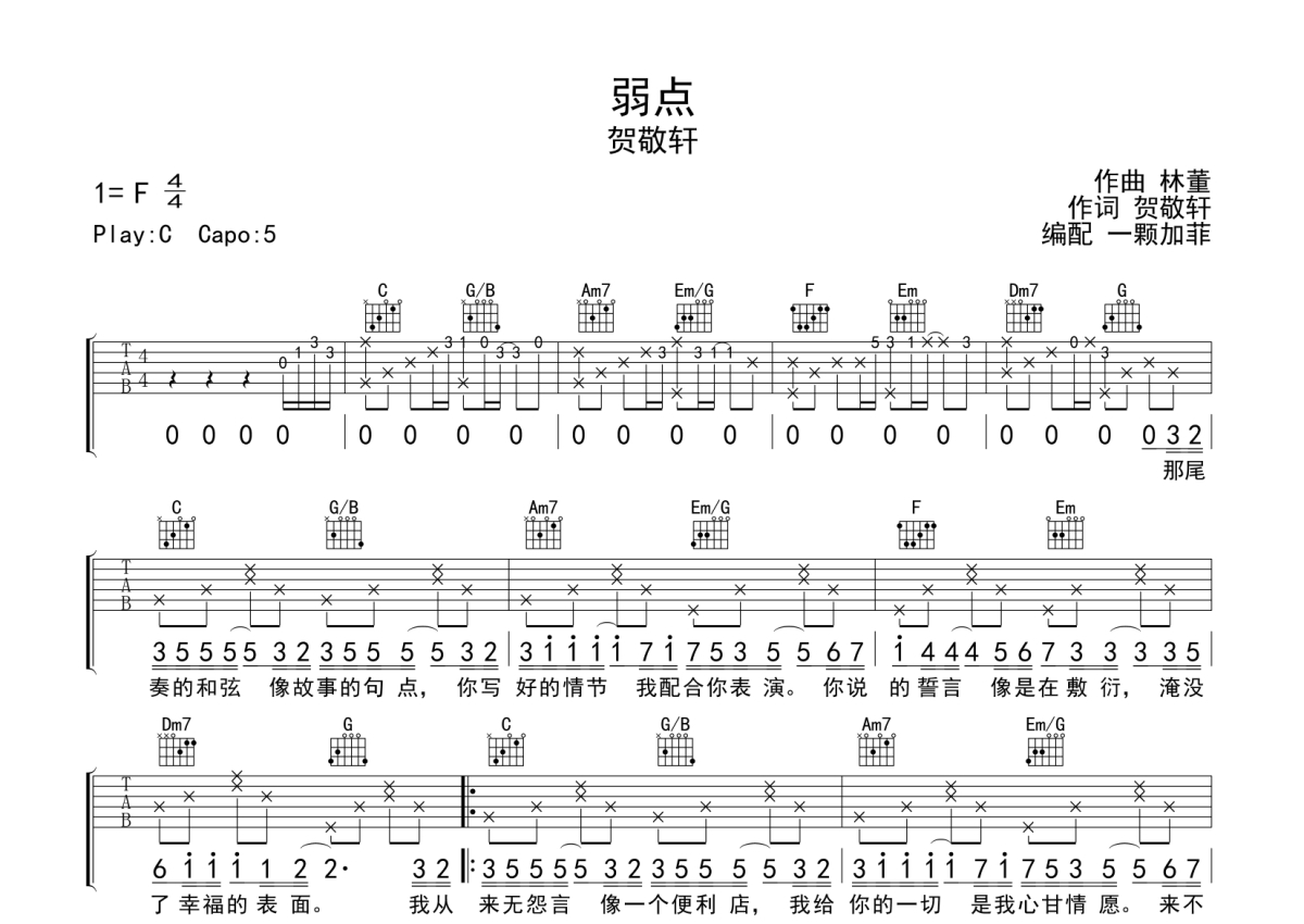 张敬轩《弱点》吉他谱 - C调弹唱六线谱