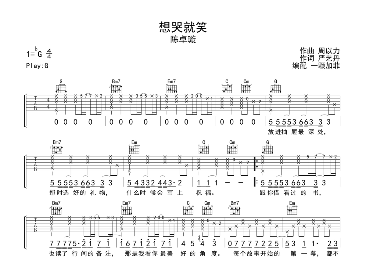 陈卓璇《想哭就笑》吉他谱 - G调弹唱六线谱