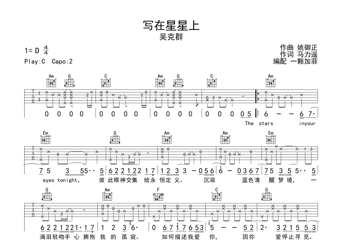 写在星星上吉他谱 - 吴克群演唱 - C调弹唱六线谱