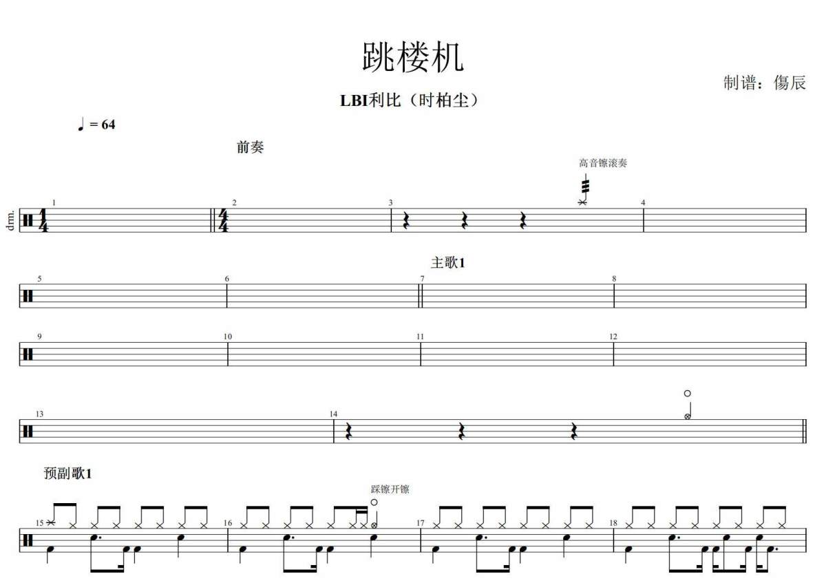 《跳楼机》是LBI利比(时柏尘)演唱的一首歌曲,拍号为4/4拍,歌曲速度为每分钟64拍,这份架子鼓谱共有两张高清图谱,图谱由 @打鼓的蟹老板 编配上传,图谱使用五线谱编配,使用这份跳楼机架子鼓谱,你将能够轻松地敲打出这首LBI利比(时柏尘)的跳楼机,快来尝试吧。