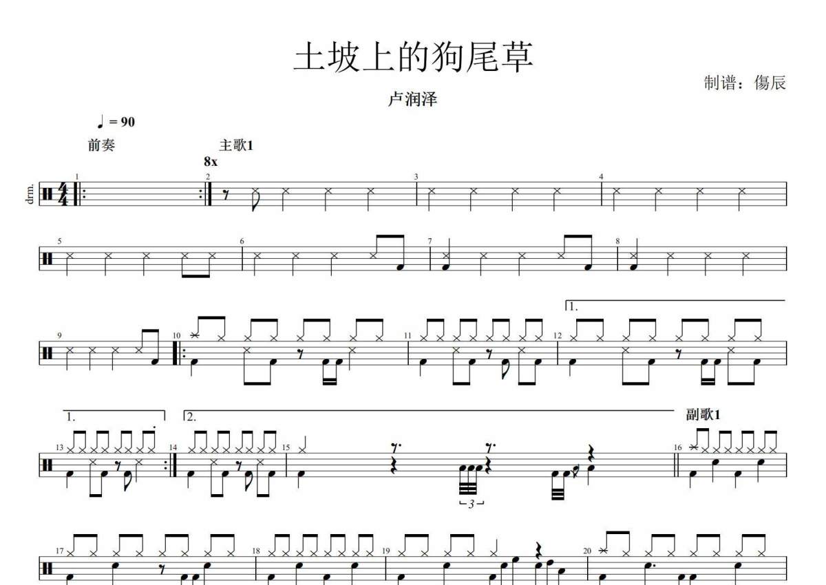 《土坡上的狗尾草》是卢润泽演唱的一首歌曲,这份架子鼓谱共有两张高清图谱,图谱由 @打鼓的蟹老板 编配上传,图谱使用五线谱编配,使用这份土坡上的狗尾草架子鼓谱,你将能够轻松地敲打出这首卢润泽的土坡上的狗尾草,快来尝试吧。