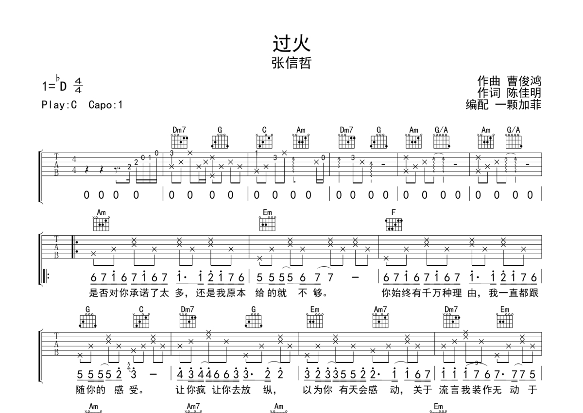 《过火》是张信哲演唱的一首歌曲,本吉他谱采用的是C调指法编配,这份吉他谱共有两张高清图谱,图谱由 @一颗加菲 编配上传,图谱使用六线谱编配,包含吉他和弦指法、简谱以及歌词部分,曲谱配备了相关的音频提供试听,使用这份过火吉他谱,可以让你更加方便地掌握这首歌曲的弹唱技巧,快来尝试吧。
