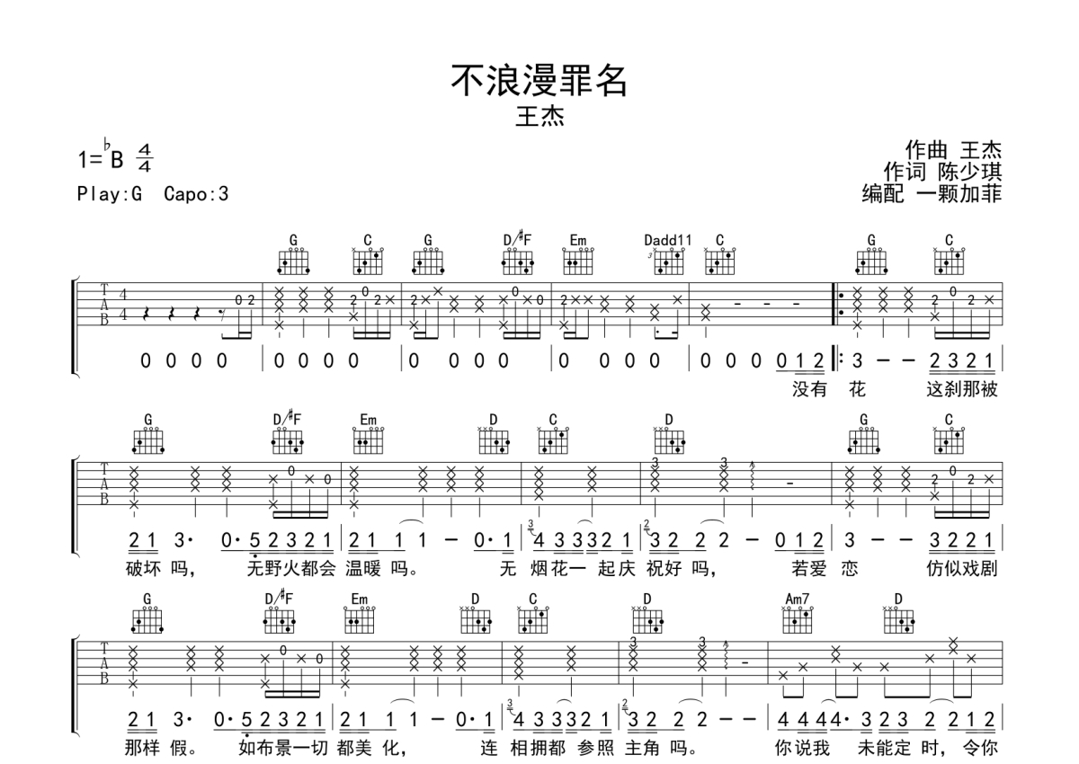 《不浪漫罪名》是王杰演唱的一首歌曲,本吉他谱采用的是G调指法编配,这份吉他谱共有两张高清图谱,图谱由 @一颗加菲 编配上传,图谱使用六线谱编配,包含吉他和弦指法、简谱以及歌词部分,曲谱配备了相关的音频提供试听,使用这份不浪漫罪名吉他谱,可以让你更加方便地掌握这首歌曲的弹唱技巧,快来尝试吧。