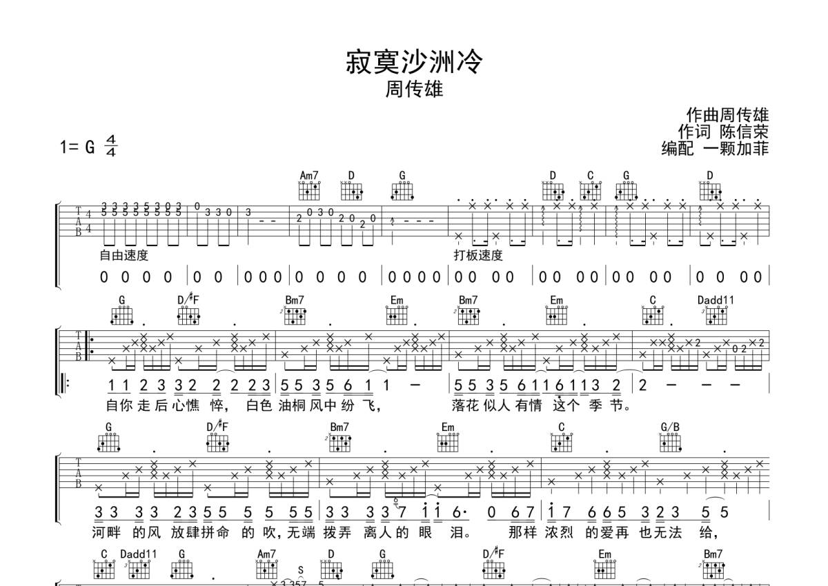 周传雄《寂寞沙洲冷》吉他谱 - G调弹唱六线谱