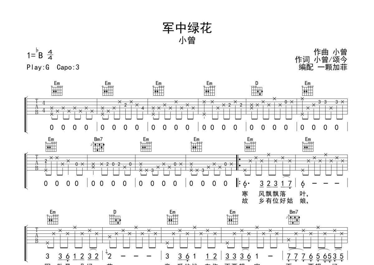《军中绿花》是小曾演唱的一首歌曲,本吉他谱采用的是G调指法编配,这份吉他谱共有两张高清图谱,图谱由 @一颗加菲 编配上传,图谱使用六线谱编配,包含吉他和弦指法、简谱以及歌词部分,曲谱配备了相关的音频提供试听,使用这份军中绿花吉他谱,可以让你更加方便地掌握这首歌曲的弹唱技巧,快来尝试吧。