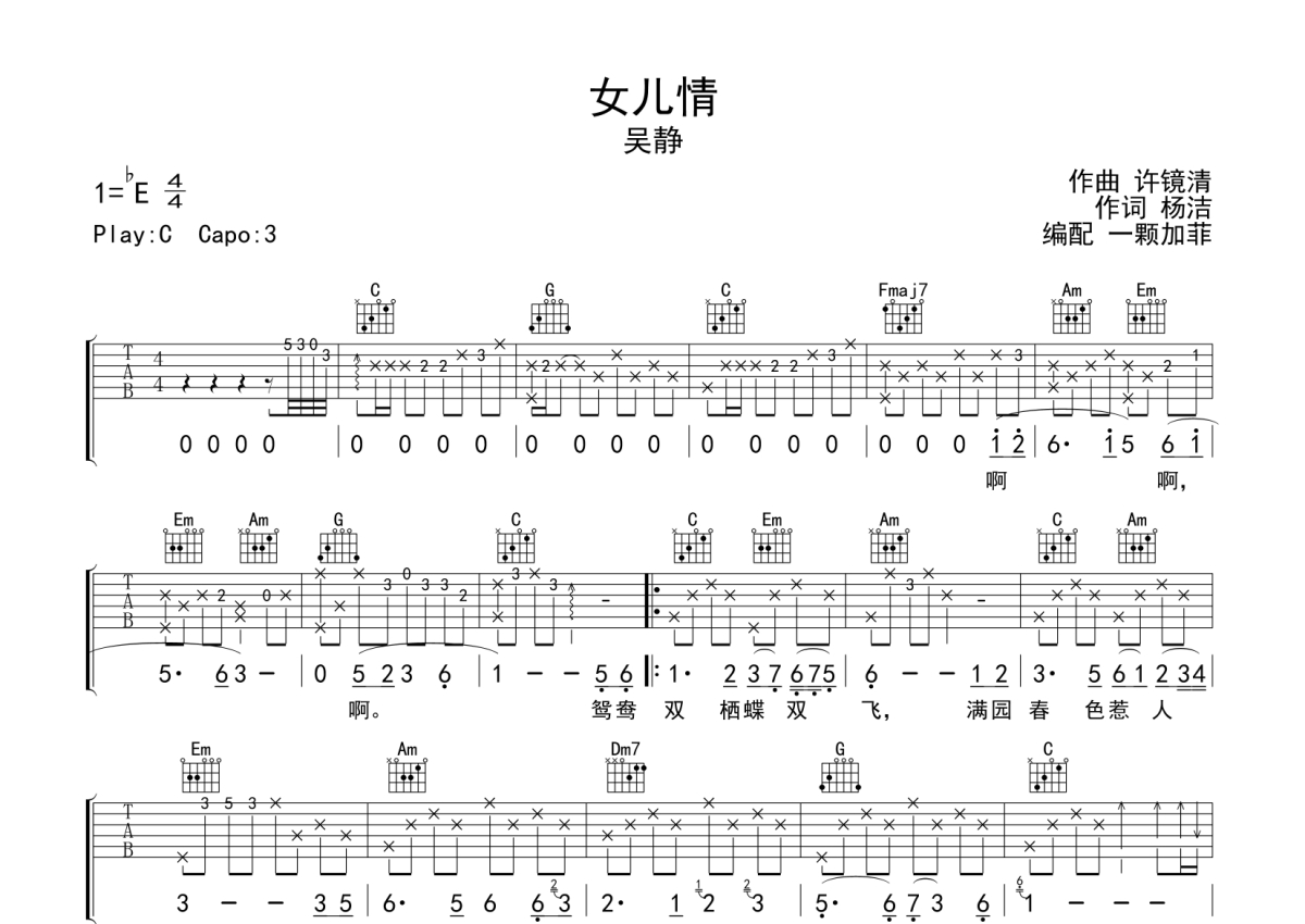 《女儿情》是吴静演唱的一首歌曲,本吉他谱采用的是C调指法编配,这份吉他谱共有两张高清图谱,图谱由 @一颗加菲 编配上传,图谱使用六线谱编配,包含吉他和弦指法、简谱以及歌词部分,曲谱配备了相关的音频提供试听,使用这份女儿情吉他谱,可以让你更加方便地掌握这首歌曲的弹唱技巧,快来尝试吧。