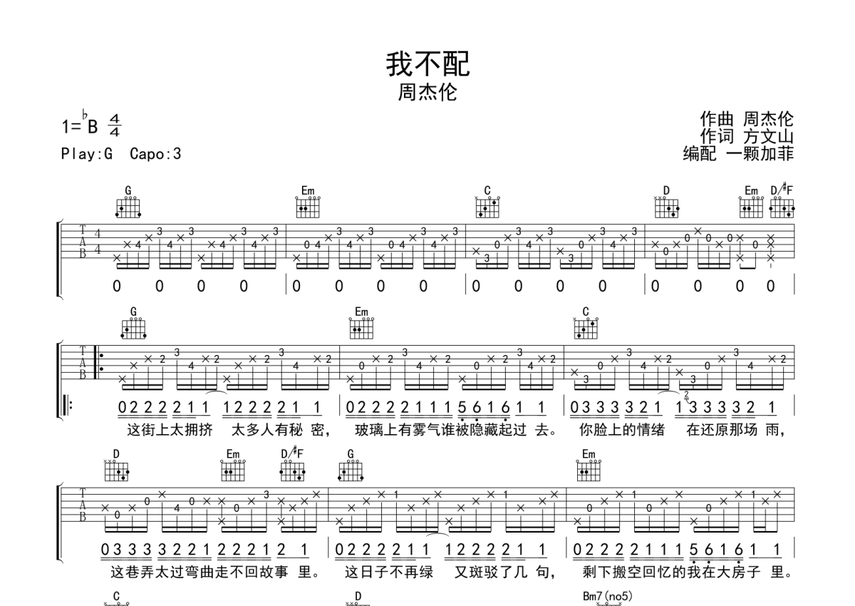 我不配吉他谱 - 周杰伦演唱 - G调弹唱六线谱