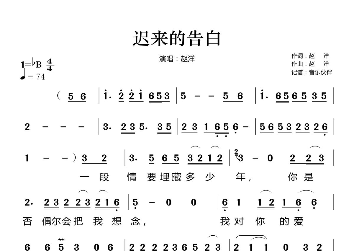 《迟来的告白》是赵洋演唱的一首歌曲,拍号为4/4拍,歌曲速度为每分钟74拍,这份简谱共有两张高清图谱,图谱由 @音乐伙伴 编配上传。