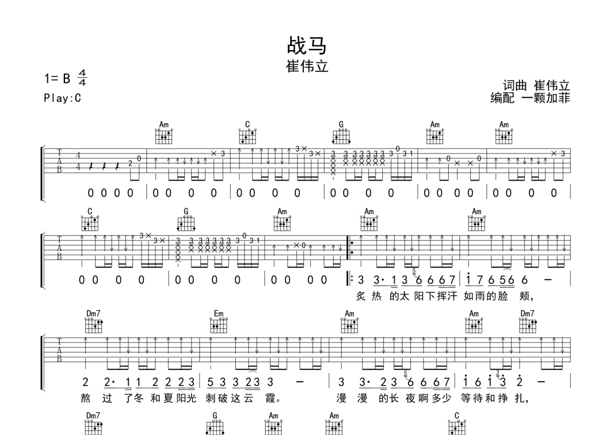 崔伟立《战马》吉他谱 - C调弹唱六线谱