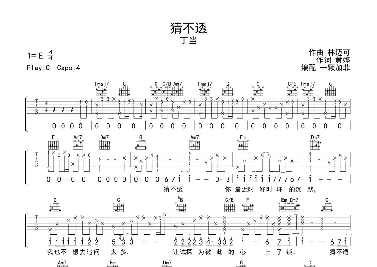 丁当《猜不透》吉他谱 - C调弹唱六线谱
