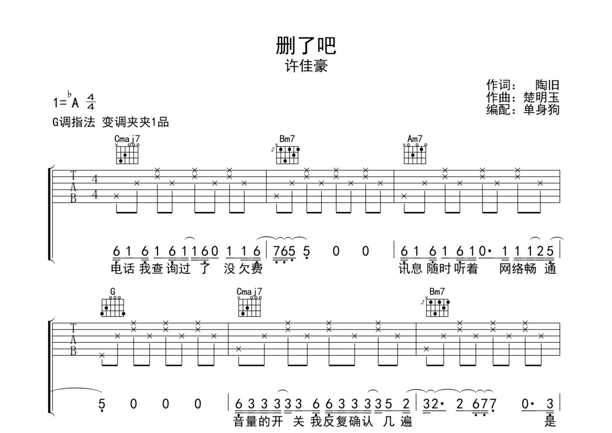 许佳豪《删了吧》吉他谱 - G调弹唱六线谱