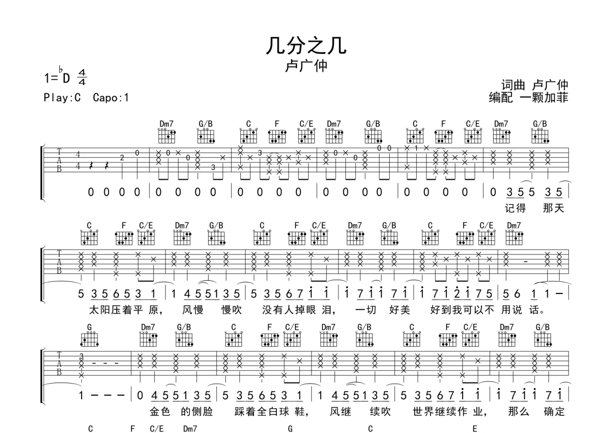 《几分之几》是卢广仲演唱的一首歌曲,本吉他谱采用的是C调指法编配,这份吉他谱共有两张高清图谱,图谱由 @一颗加菲 编配上传,图谱使用六线谱编配,包含吉他和弦指法、简谱以及歌词部分,曲谱配备了相关的音频提供试听,使用这份几分之几吉他谱,可以让你更加方便地掌握这首歌曲的弹唱技巧,快来尝试吧。