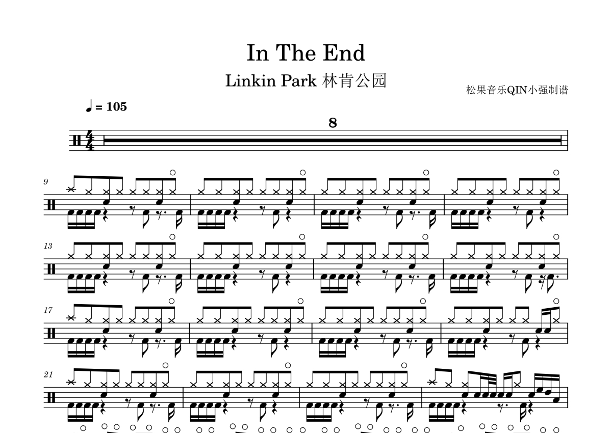 《In the End》是Linkin Park演唱的一首歌曲,拍号为4/4拍,这份架子鼓谱共有两张高清图谱,图谱由 @松果音乐QIN小强 编配上传,图谱使用五线谱编配,使用这份In the End架子鼓谱,你将能够轻松地敲打出这首Linkin Park的In the End,快来尝试吧。《In the End》是美国摇滚乐队Linkin Park演唱的歌曲,由查斯特·贝宁顿、布莱德·德尔森、约瑟夫·韩、麦克·信田、罗伯·巴登填词、谱曲。歌曲被收录在林肯公园首张录音室专辑《Hybrid Theory》中,于2001年10月9日作为专辑的第四支单曲发行。