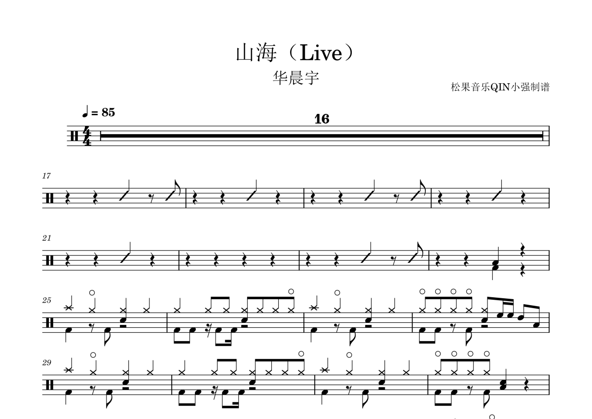 《山海(Live)》是Live演唱的一首歌曲,拍号为4/4拍,这份架子鼓谱共有两张高清图谱,图谱由 @松果音乐QIN小强 编配上传,图谱使用五线谱编配,使用这份山海(Live)架子鼓谱,你将能够轻松地敲打出这首Live的山海(Live),快来尝试吧。《山海》是华晨宇改编自草东没有派对演唱的一首歌曲。该改编曲目于2018年3月16日在《歌手2018》演出。华晨宇在《歌手》第九期竞演中,演唱了一首摇滚歌曲《山海》,这首歌是改编自草东没有派对的原创作品,词曲均由草东没有派对创作,并于2018年3月16日发布,收录在专辑《歌手第二季第9期》内。