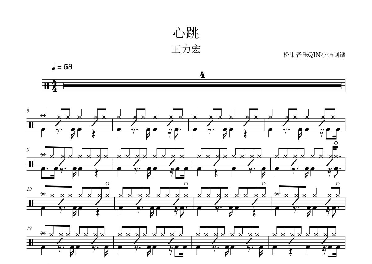 《心跳》是王力宏演唱的一首歌曲,拍号为4/4拍,这份架子鼓谱共有两张高清图谱,图谱由 @松果音乐QIN小强 编配上传,图谱使用五线谱编配,使用这份心跳架子鼓谱,你将能够轻松地敲打出这首王力宏的心跳,快来尝试吧。《心跳》是王力宏演唱的一首歌曲,由王力宏作曲、编曲,并与易家扬共同填词 ,收录在王力宏2008年12月26日发行的同名专辑《心·跳》中。