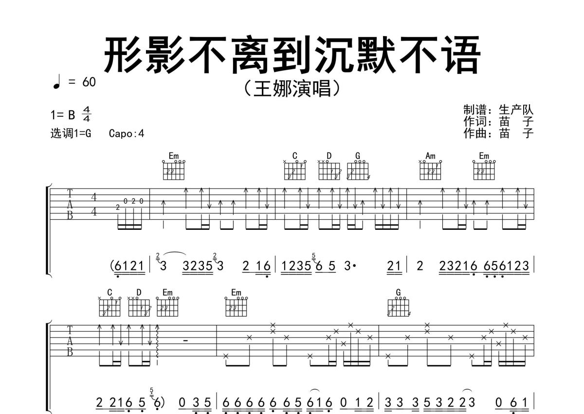 《形影不离到沉默不语》是王娜演唱的一首歌曲,精编完美版,拍号为4/4拍,歌曲速度为每分钟60拍,歌曲原调为B调,但由于原调指法比较难,为了方便弹奏,本吉他谱采用的是G调指法编配,变调夹4品弹奏即为原调,当然也可以根据自己的音域改变变调夹位置,或者通过改变和弦调性,以方便自己弹奏,这份吉他谱共有三张高清图谱,图谱由 @生产队 编配上传,图谱使用六线谱编配,包含吉他和弦指法、简谱以及歌词部分,使用这份形影不离到沉默不语吉他谱,可以让你更加方便地掌握这首歌曲的弹唱技巧,快来尝试吧。王娜演唱的歌曲《形影不离到沉默不语》原版吉他谱,精准的前奏、间奏、尾奏solo编配,精编完美版,值得推荐!。