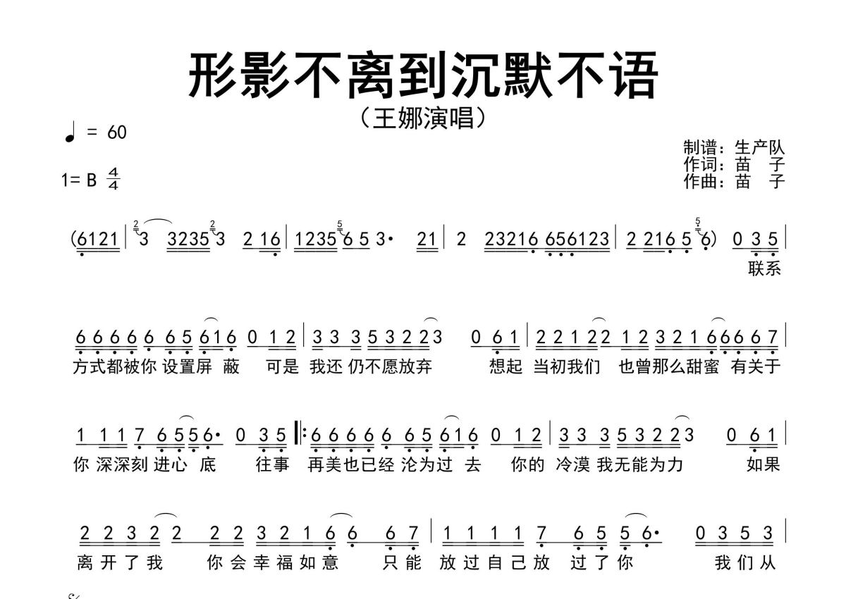 《形影不离到沉默不语》是王娜演唱的一首歌曲,原版简谱,拍号为4/4拍,歌曲速度为每分钟60拍,这份简谱共有一张高清图谱,图谱由 @生产队 编配上传王娜演唱的歌曲《形影不离到沉默不语》原版简谱,精准的前奏、间奏、尾奏solo编配,精编完美版,值得推荐!。