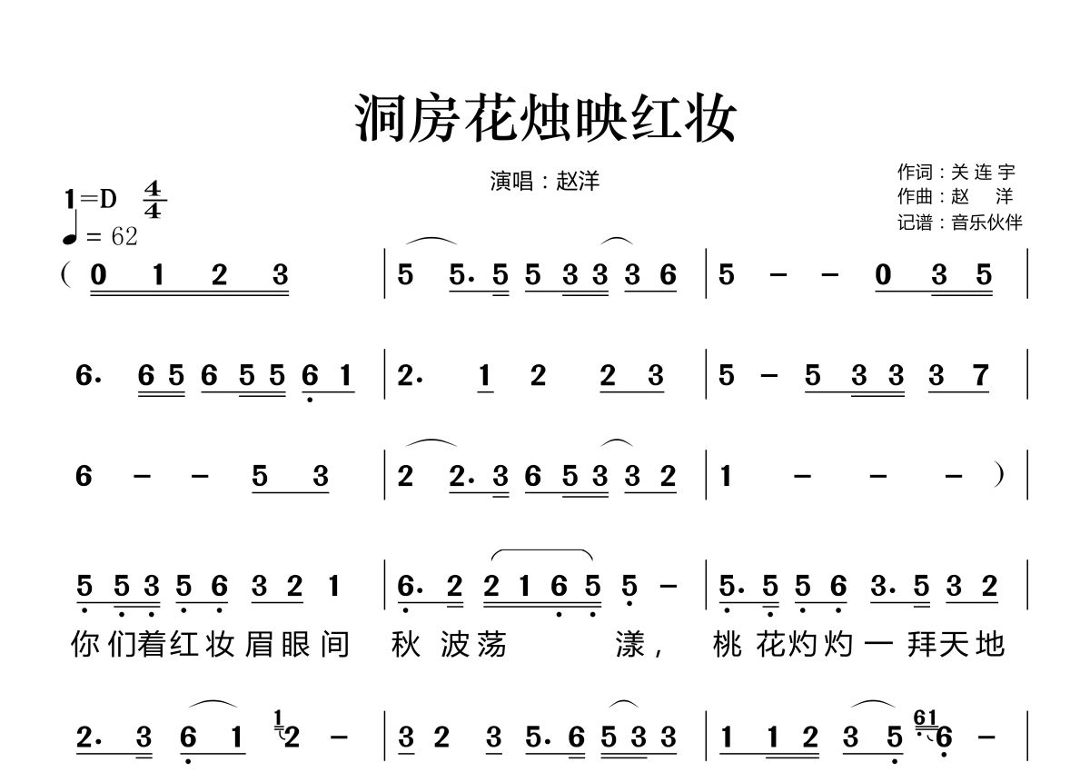 《洞房花烛映红妆》是赵洋演唱的一首歌曲,拍号为4/4拍,歌曲速度为每分钟62拍,这份简谱共有两张高清图谱,图谱由 @音乐伙伴 编配上传。