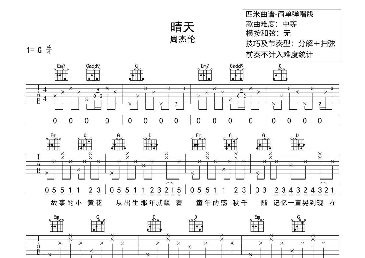 晴天吉他谱 - 周杰伦演唱 - G调弹唱六线谱