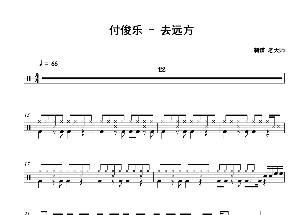 《去远方》是付俊乐演唱的一首歌曲,拍号为4/4拍,歌曲速度为每分钟66拍,这份架子鼓谱共有两张高清图谱,图谱由 @172****8519 编配上传,图谱使用五线谱编配,使用这份去远方架子鼓谱,你将能够轻松地敲打出这首付俊乐的去远方,快来尝试吧。