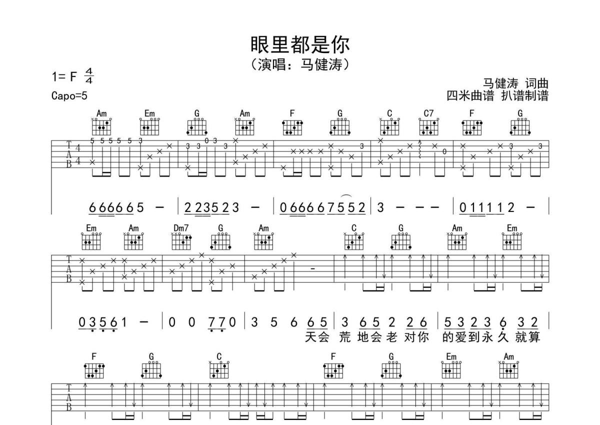 马健涛《眼里都是你》吉他谱 - C调弹唱六线谱