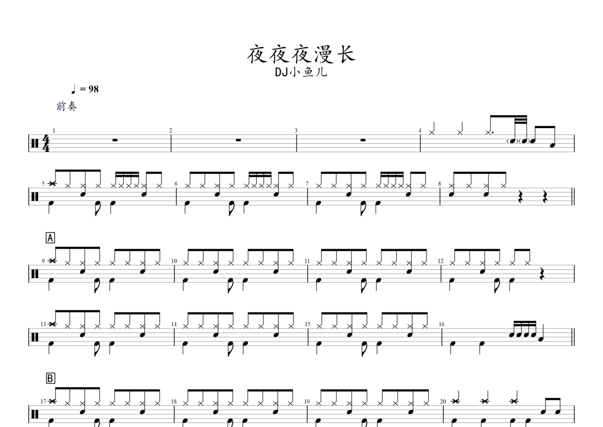 DJ小鱼儿《夜夜夜漫长》架子鼓谱