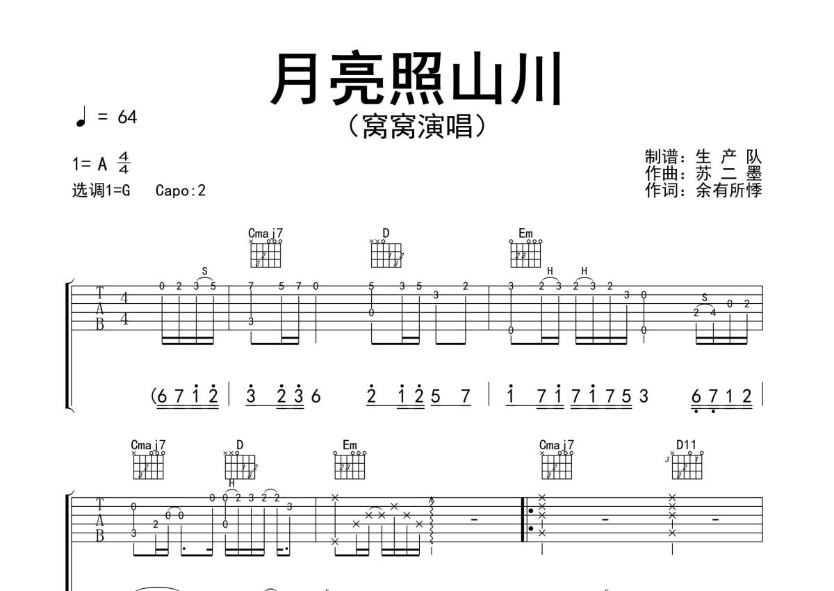 《月亮照山川》是窝窝演唱的一首歌曲,精编完美版,拍号为4/4拍,歌曲速度为每分钟64拍,歌曲原调为A调,但由于原调指法比较难,为了方便弹奏,本吉他谱采用的是G调指法编配,变调夹2品弹奏即为原调,当然也可以根据自己的音域改变变调夹位置,或者通过改变和弦调性,以方便自己弹奏,这份吉他谱共有三张高清图谱,图谱由 @生产队 编配上传,图谱使用六线谱编配,包含吉他和弦指法、简谱以及歌词部分,使用这份月亮照山川吉他谱,可以让你更加方便地掌握这首歌曲的弹唱技巧,快来尝试吧。窝窝演唱的歌曲《月亮照山川》原版吉他谱,精准的前奏、间奏、尾奏solo编配,精编完美版,值得推荐!。