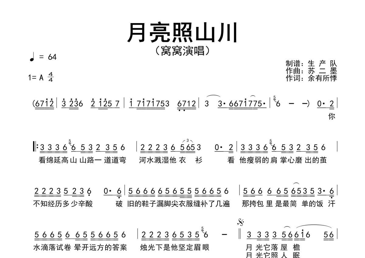《月亮照山川》是窝窝演唱的一首歌曲,原版简谱,拍号为4/4拍,歌曲速度为每分钟64拍,这份简谱共有一张高清图谱,图谱由 @生产队 编配上传窝窝演唱的歌曲《月亮照山川》原版简谱,精准的前奏、间奏、尾奏solo编配,精编完美版,值得推荐!。