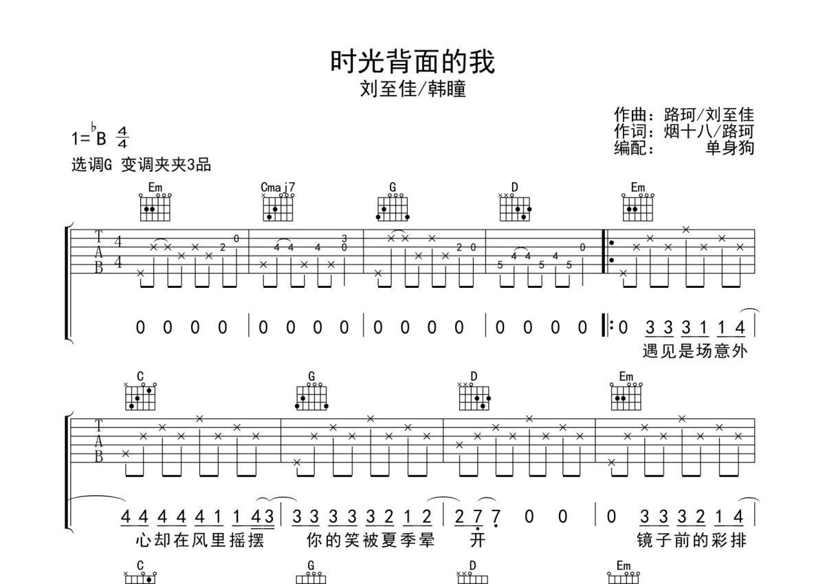 《时光背面的我》是刘至佳/韩瞳演唱的一首歌曲,本吉他谱采用的是G调指法编配,这份吉他谱共有三张高清图谱,图谱由 @单身狗 编配上传,图谱使用六线谱编配,包含吉他和弦指法、简谱以及歌词部分,使用这份时光背面的我吉他谱,可以让你更加方便地掌握这首歌曲的弹唱技巧,快来尝试吧。刘至佳/韩瞳《时光背面的我》吉他弹唱谱,采用G调指法编配,单身狗编配出品,共有3张高清图谱。