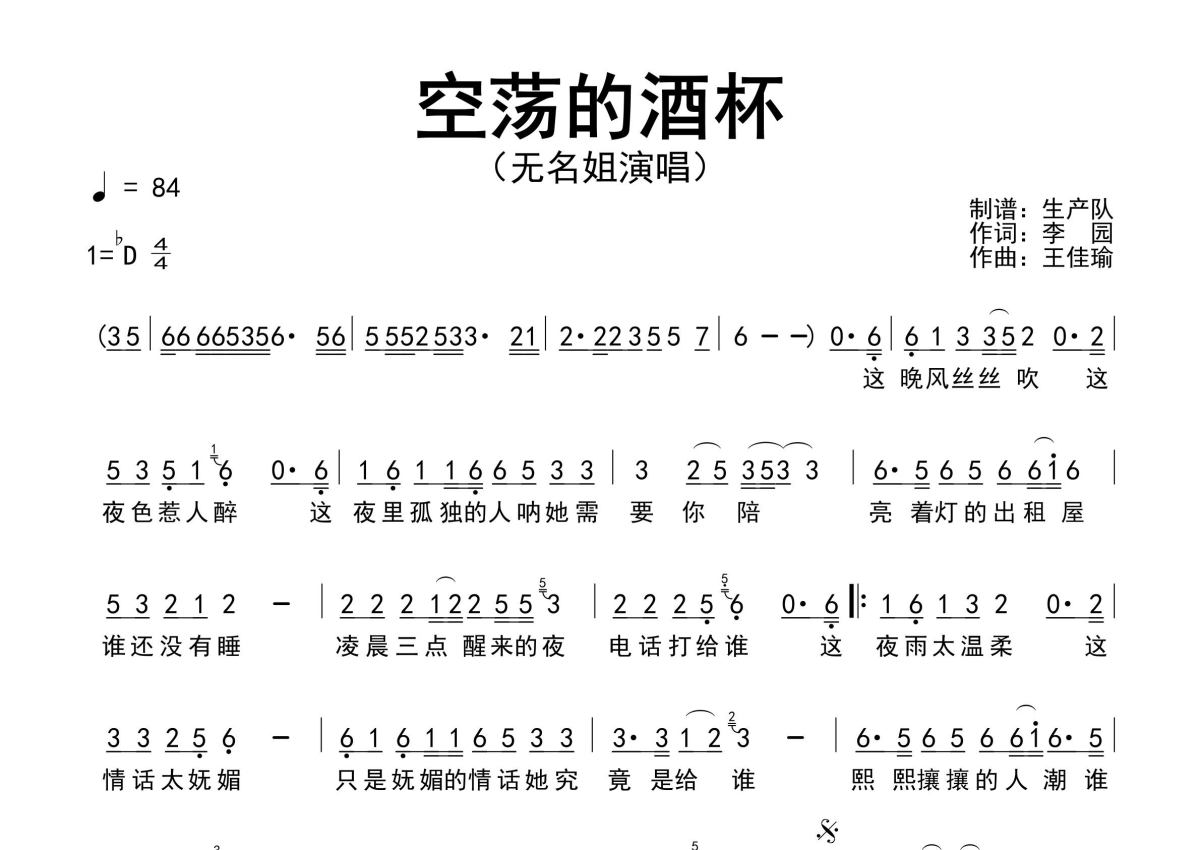 《空荡的酒杯》是无名姐(路宝)演唱的一首歌曲,原版简谱,拍号为4/4拍,歌曲速度为每分钟84拍,这份简谱共有一张高清图谱,图谱由 @生产队 编配上传无名姐(路宝)演唱的歌曲《空荡的酒杯》原版简谱,精准的前奏、间奏solo编配,精编完美版,值得推荐!。