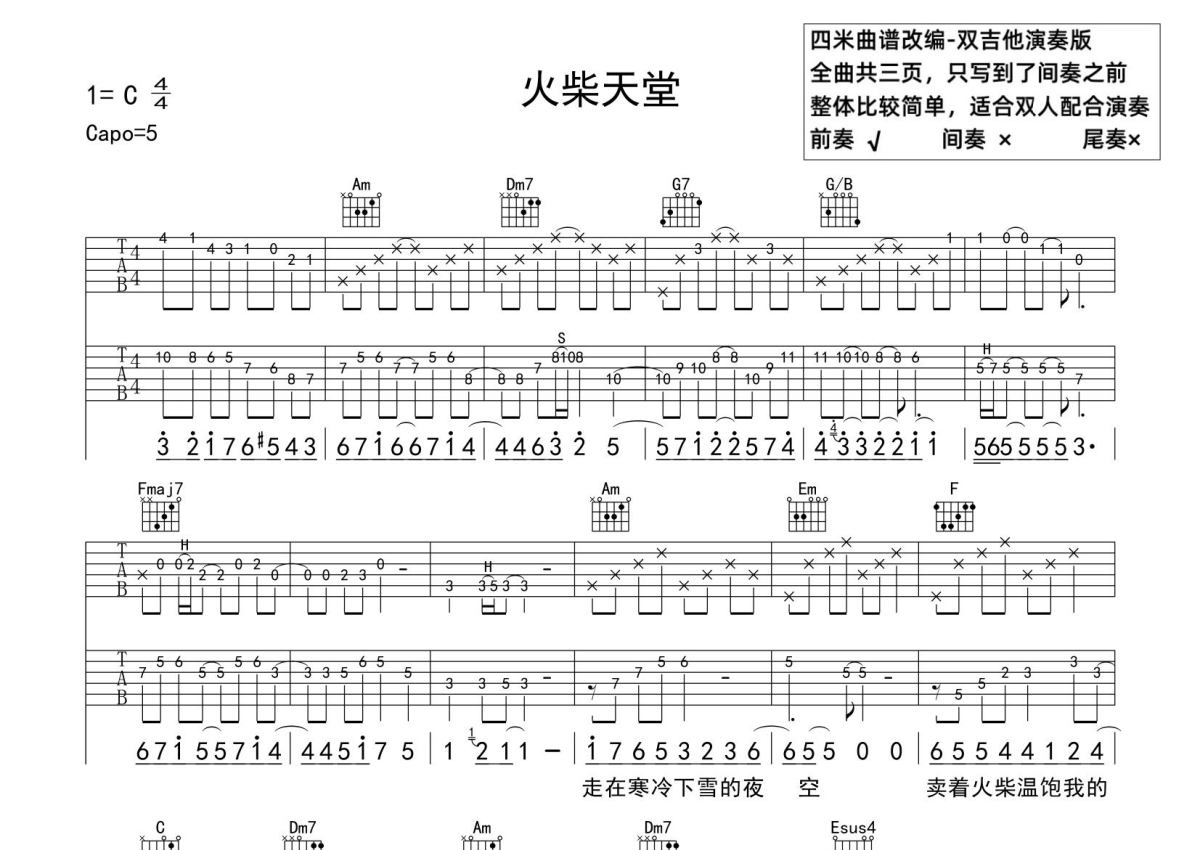 《火柴天堂》是齐秦演唱的一首歌曲,本吉他谱采用的是C调指法编配,这份吉他谱共有三张高清图谱,图谱由 @SRV7758521 编配上传,图谱使用六线谱编配,包含吉他和弦指法、简谱以及歌词部分,使用这份火柴天堂吉他谱,可以让你更加方便地掌握这首歌曲的弹唱技巧,快来尝试吧。