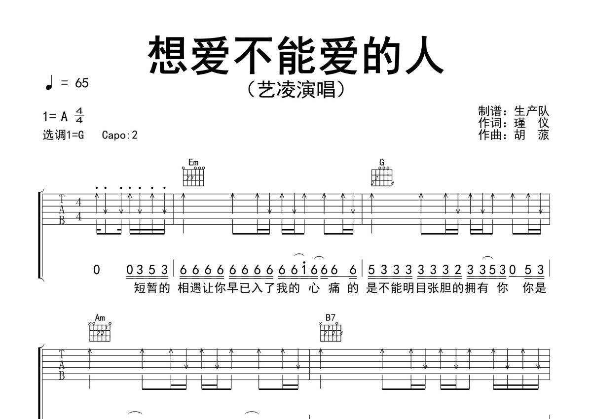《想爱不能爱的人》是艺凌演唱的一首歌曲,精编完美版,拍号为4/4拍,歌曲速度为每分钟65拍,歌曲原调为A调,但由于原调指法比较难,为了方便弹奏,本吉他谱采用的是G调指法编配,变调夹2品弹奏即为原调,当然也可以根据自己的音域改变变调夹位置,或者通过改变和弦调性,以方便自己弹奏,这份吉他谱共有三张高清图谱,图谱由 @生产队 编配上传,图谱使用六线谱编配,包含吉他和弦指法、简谱以及歌词部分,使用这份想爱不能爱的人吉他谱,可以让你更加方便地掌握这首歌曲的弹唱技巧,快来尝试吧。艺凌演唱的歌曲《想爱不能爱的人》原版吉他谱,精准的前奏、间奏、尾奏solo编配,精编完美版,值得推荐!。