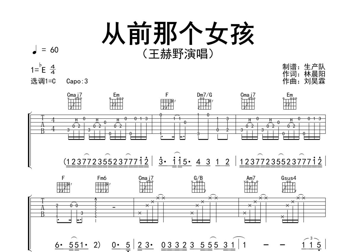 《从前那个女孩》是王赫野演唱的一首歌曲,精编完美版,拍号为4/4拍,歌曲速度为每分钟60拍,歌曲原调为Eb调,但由于原调指法比较难,为了方便弹奏,本吉他谱采用的是C调指法编配,变调夹3品弹奏即为原调,当然也可以根据自己的音域改变变调夹位置,或者通过改变和弦调性,以方便自己弹奏,这份吉他谱共有三张高清图谱,图谱由 @生产队 编配上传,图谱使用六线谱编配,包含吉他和弦指法、简谱以及歌词部分,使用这份从前那个女孩吉他谱,可以让你更加方便地掌握这首歌曲的弹唱技巧,快来尝试吧。王赫野演唱的歌曲《从前那个女孩》原版吉他谱,精准的前奏、间奏solo编配,精编完美版,值得推荐!。