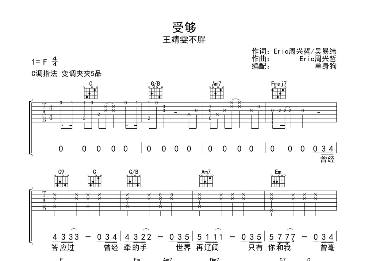 王靖雯不胖《受够》吉他谱 - C调弹唱六线谱