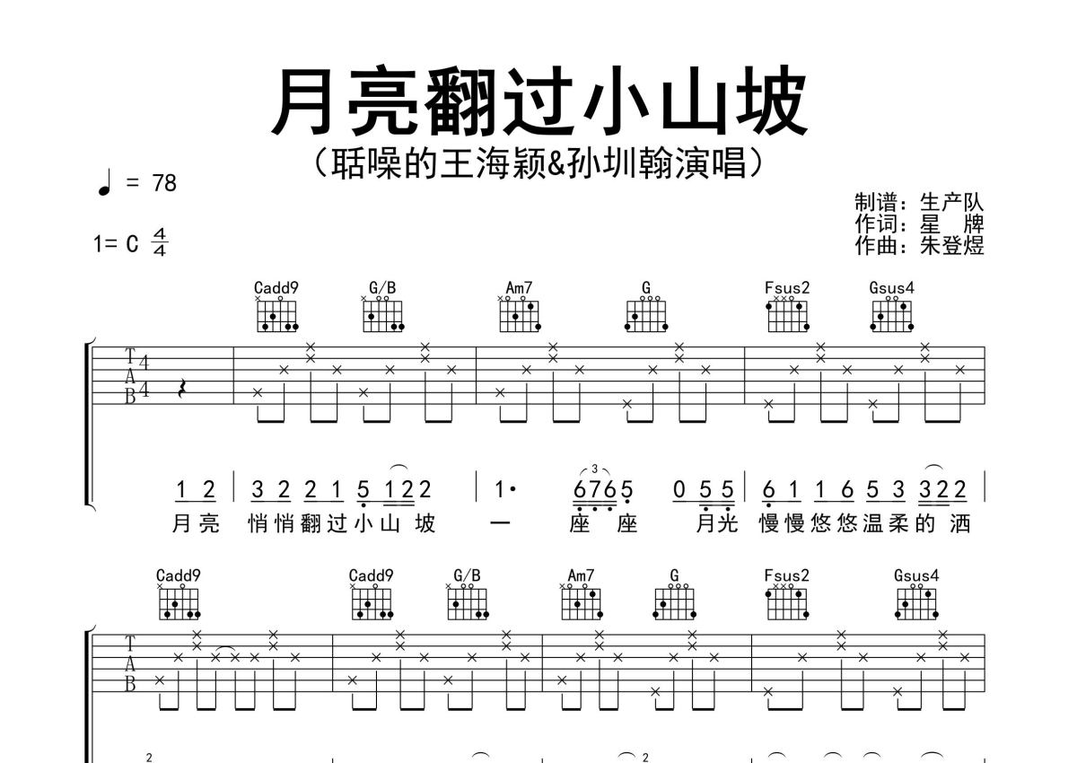 《月亮翻过小山坡》是聒噪的王海颖&孙圳翰演唱的一首歌曲,精编完美版,拍号为4/4拍,歌曲速度为每分钟78拍,歌曲原调为C调,本吉他谱采用的是C调指法编配,演奏时不需要使用变调夹即为原调,这份吉他谱共有三张高清图谱,图谱由 @生产队 编配上传,图谱使用六线谱编配,包含吉他和弦指法、简谱以及歌词部分,使用这份月亮翻过小山坡吉他谱,可以让你更加方便地掌握这首歌曲的弹唱技巧,快来尝试吧。聒噪的王海颖&孙圳翰演唱的歌曲《月亮翻过小山坡》原版吉他谱,完整的间奏、尾奏solo编配,精编完美版,值得推荐!。
