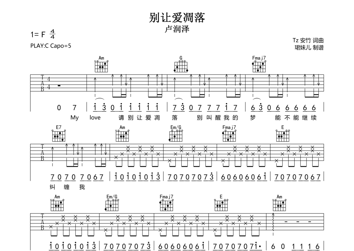 《别让爱凋落》吉他谱 - 卢润泽 - C调弹唱六线谱