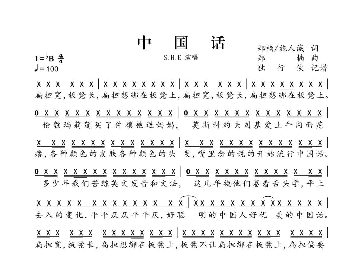 《中国话》是S.H.E演唱的一首歌曲,拍号为4/4拍,歌曲速度为每分钟100拍,这份简谱共有两张高清图谱,图谱由 @独行侠 编配上传。