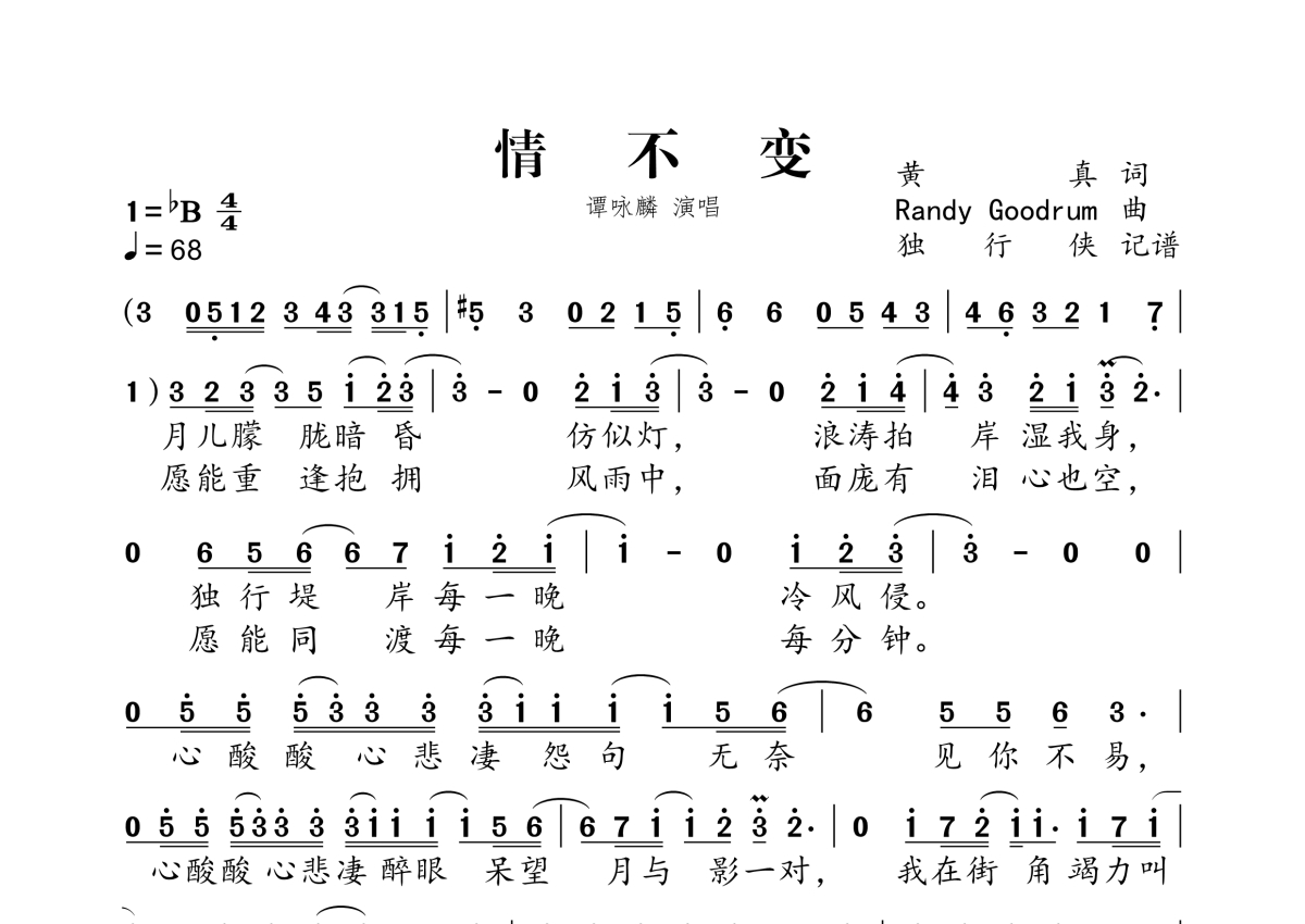 《情不变》是谭咏麟演唱的一首歌曲,拍号为4/4拍,歌曲速度为每分钟67拍,这份简谱共有一张高清图谱,图谱由 @独行侠 编配上传。