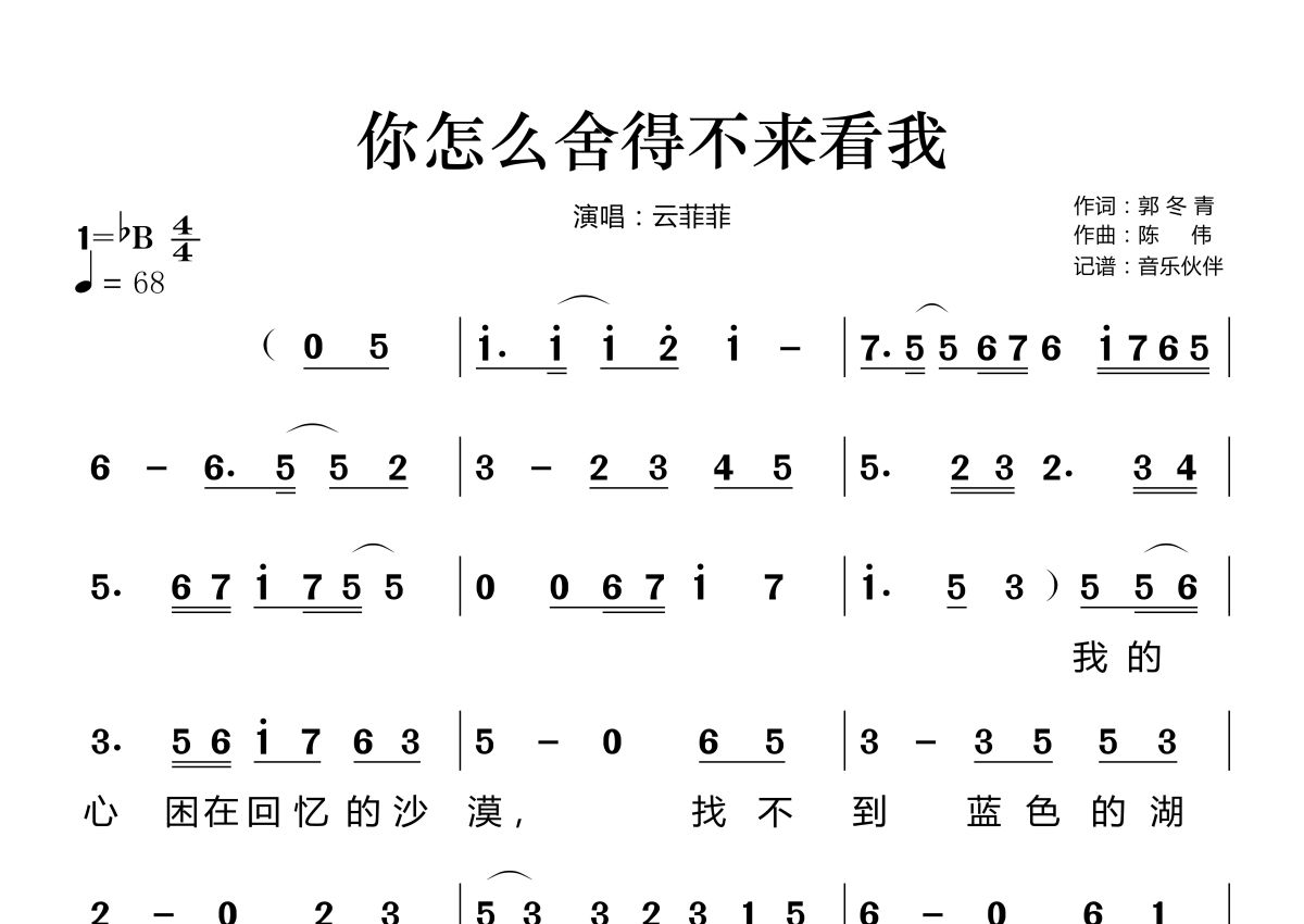 《你怎么舍得不来看我》是云菲菲演唱的一首歌曲,拍号为4/4拍,歌曲速度为每分钟68拍,这份简谱共有两张高清图谱,图谱由 @音乐伙伴 编配上传。