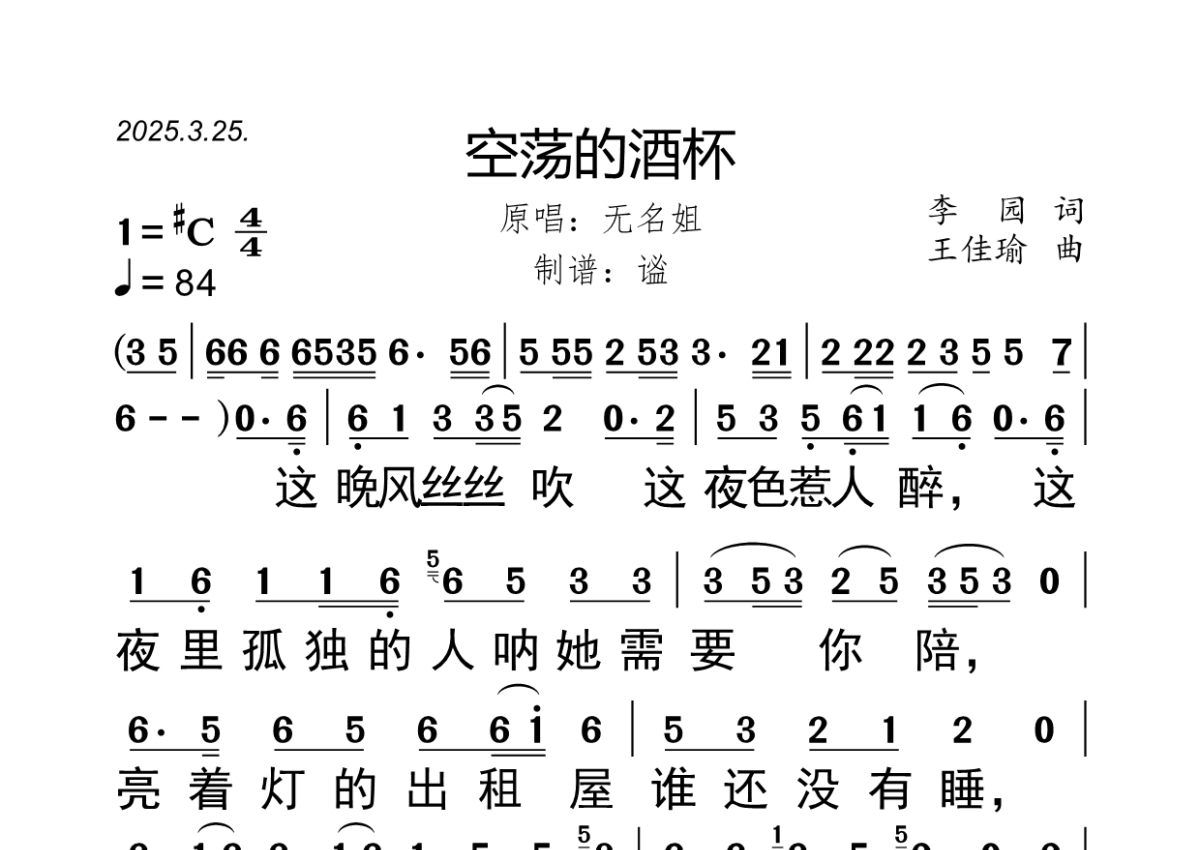 《空荡的酒杯》是无名姐演唱的一首歌曲,拍号为4/4拍,歌曲速度为每分钟84拍,这份简谱共有两张高清图谱,图谱由 @谧 编配上传无名姐(路宝)演唱的《空荡的酒杯》,2025年3月25日发行,李园作词,王佳瑜作曲,谧精心制谱,大字版,共2页。