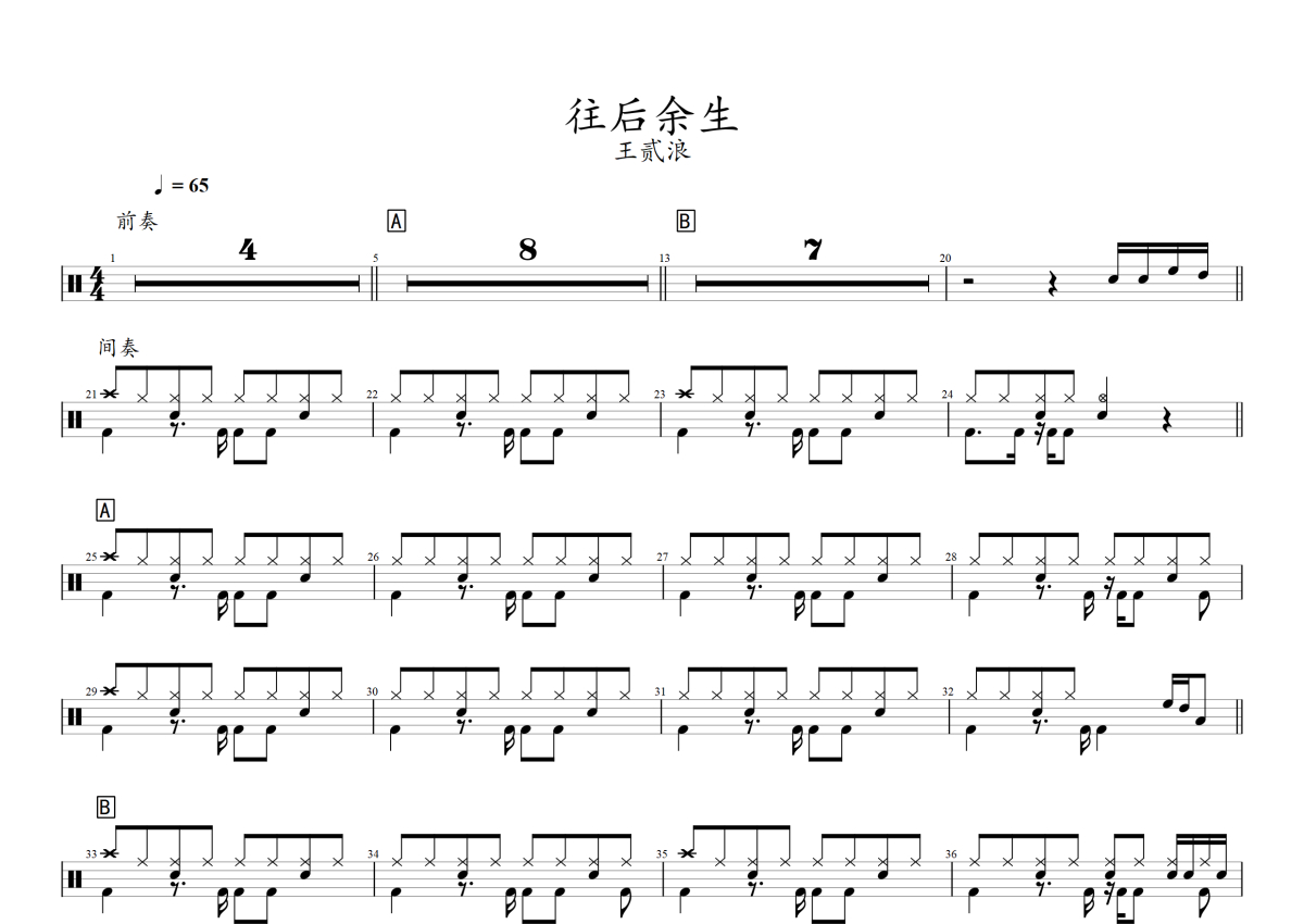 《往后余生》是王贰浪演唱的一首歌曲,拍号为4/4拍,歌曲速度为每分钟65拍,这份架子鼓谱共有一张高清图谱,图谱由 @音符喷血者 编配上传,图谱使用五线谱编配,使用这份往后余生架子鼓谱,你将能够轻松地敲打出这首王贰浪的往后余生,快来尝试吧。