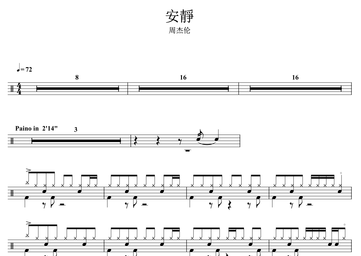 《安静》是周杰伦演唱的一首歌曲,拍号为4/4拍,歌曲速度为每分钟72拍,这份架子鼓谱共有两张高清图谱,图谱由 @音符喷血者 编配上传,图谱使用五线谱编配,使用这份安静架子鼓谱,你将能够轻松地敲打出这首周杰伦的安静,快来尝试吧。