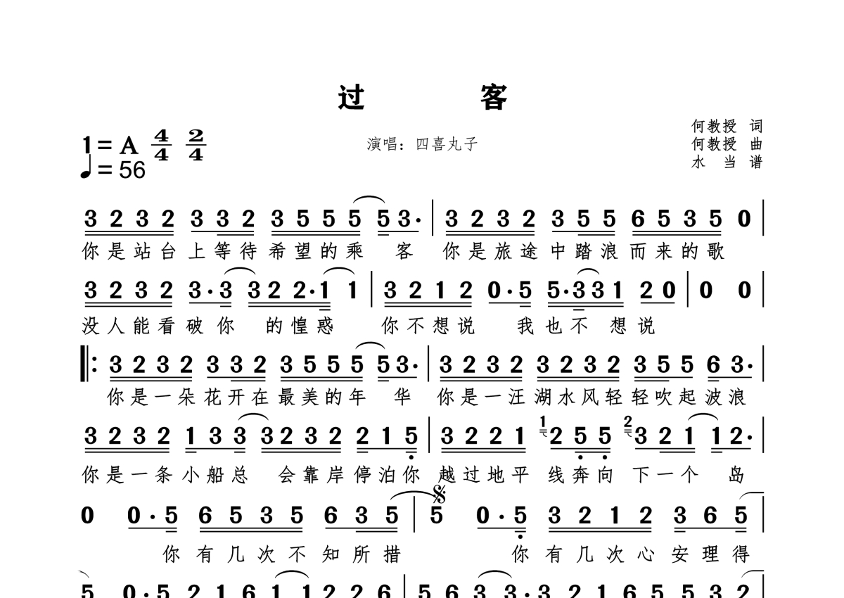《过客》是四喜丸子演唱的一首歌曲,标和弦版,这份简谱共有两张高清图谱,图谱由 @水当 编配上传四喜丸子演唱的《过客》,原调A,提供标和未标和弦两个版本。