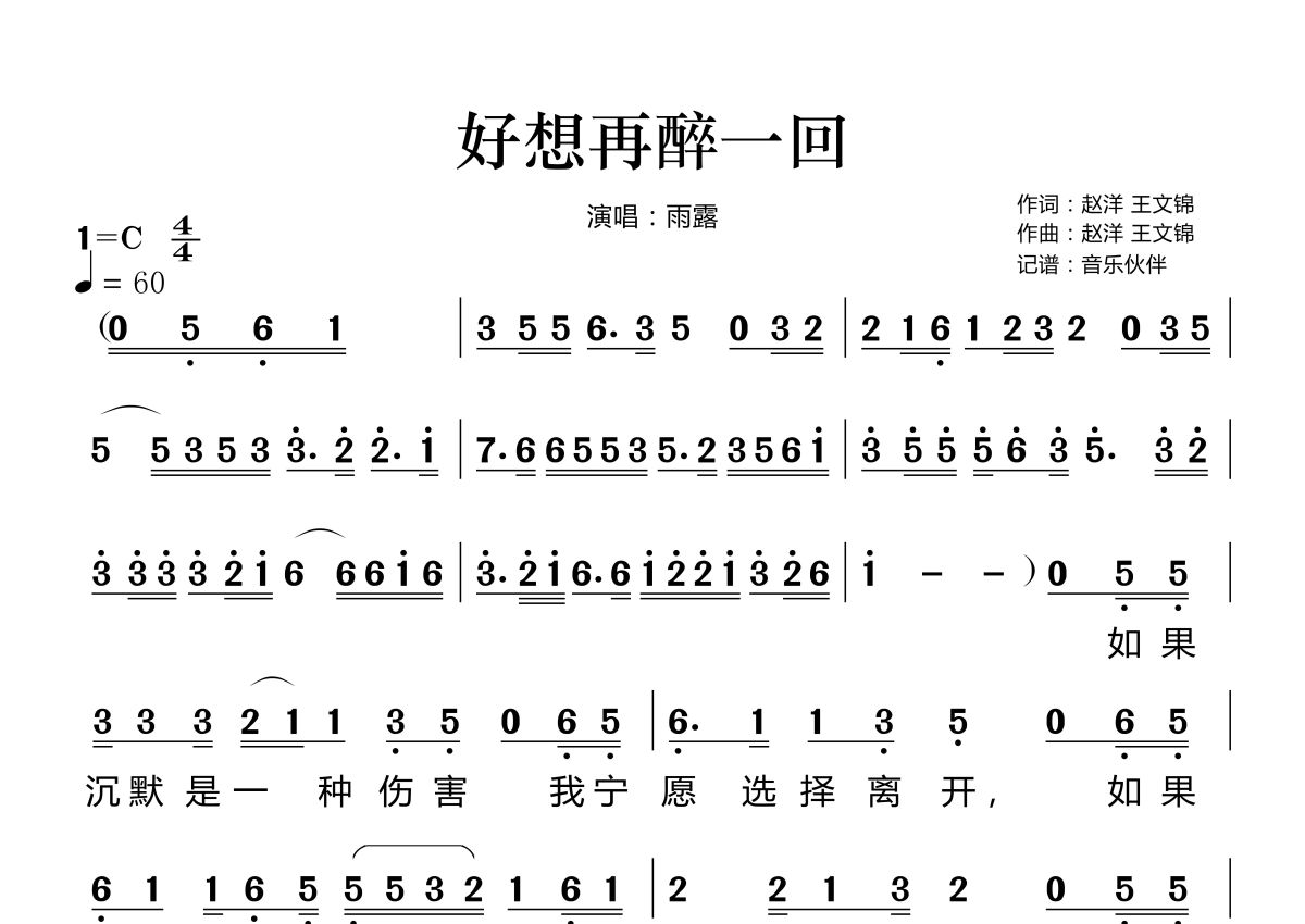 《好想再醉一回》是雨露演唱的一首歌曲,拍号为4/4拍,歌曲速度为每分钟60拍,这份简谱共有两张高清图谱,图谱由 @音乐伙伴 编配上传。