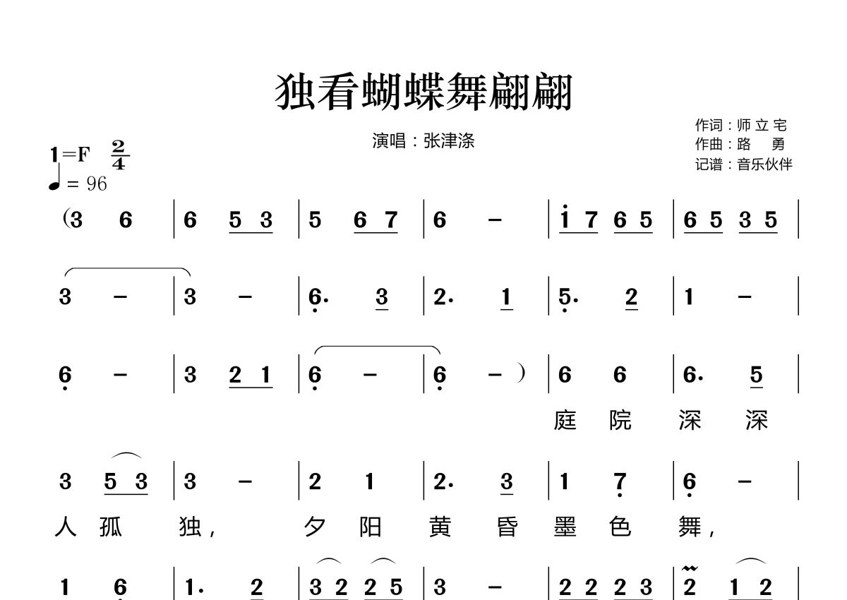 《独看蝴蝶舞翩翩》是张津涤演唱的一首歌曲,拍号为2/4拍,歌曲速度为每分钟96拍,这份简谱共有两张高清图谱,图谱由 @音乐伙伴 编配上传。