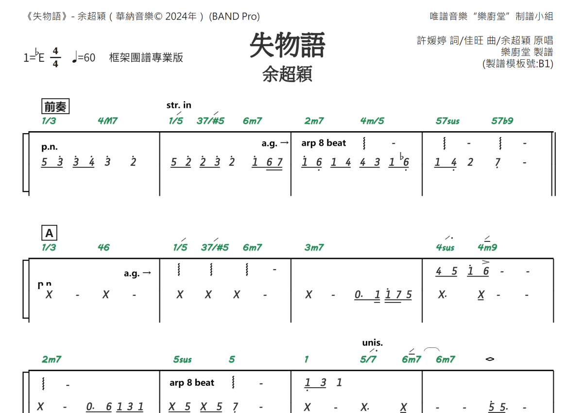 “乐厨堂”乐谱发布小组: 出版级乐谱扒谱制谱——以职业乐手圈通行标准记谱,遵循原版和声、伴奏元素和段落结构。 ❶ 2.0多功能专业团谱:采用台湾卓著公司开创的二代简谱标准制作。二代简谱无疑是迄今为止最科学、最易读的专业范畴多功能记谱方案:❷ 框架谱:采用职业乐手通常记谱方案制作。